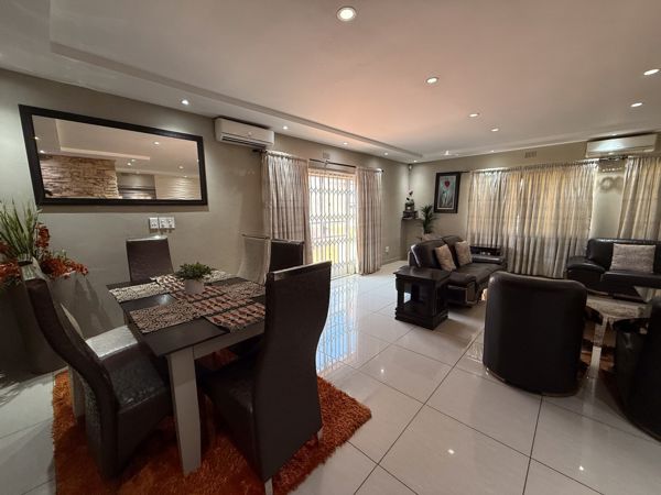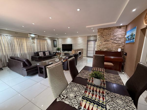 A well-proportioned kitchen with multi-functional cabinetry flows effortlessly into an open-plan living and dining area, featuring immaculate tiled floors, air-conditioning, and a striking modern fireplace. There's even enough space to create a second lounge or a dedicated work-from-home zone.