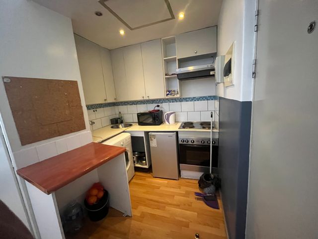 • Compact kitchen with built-in cupboards, stove, fridge & microwave