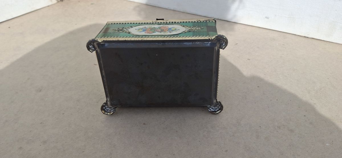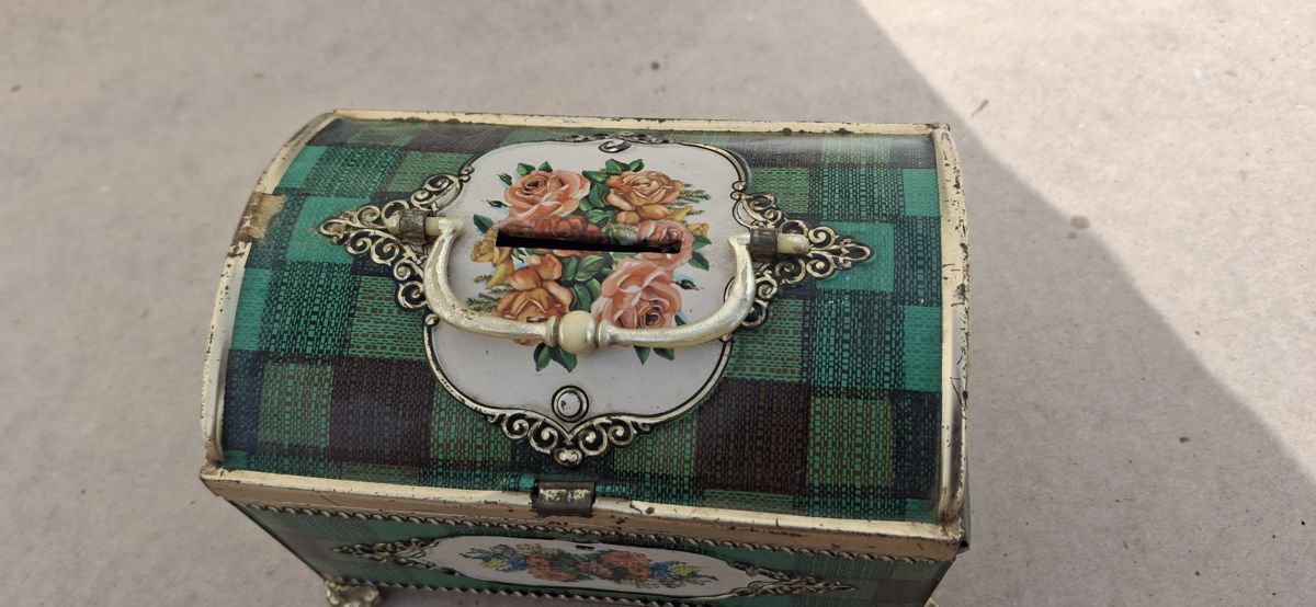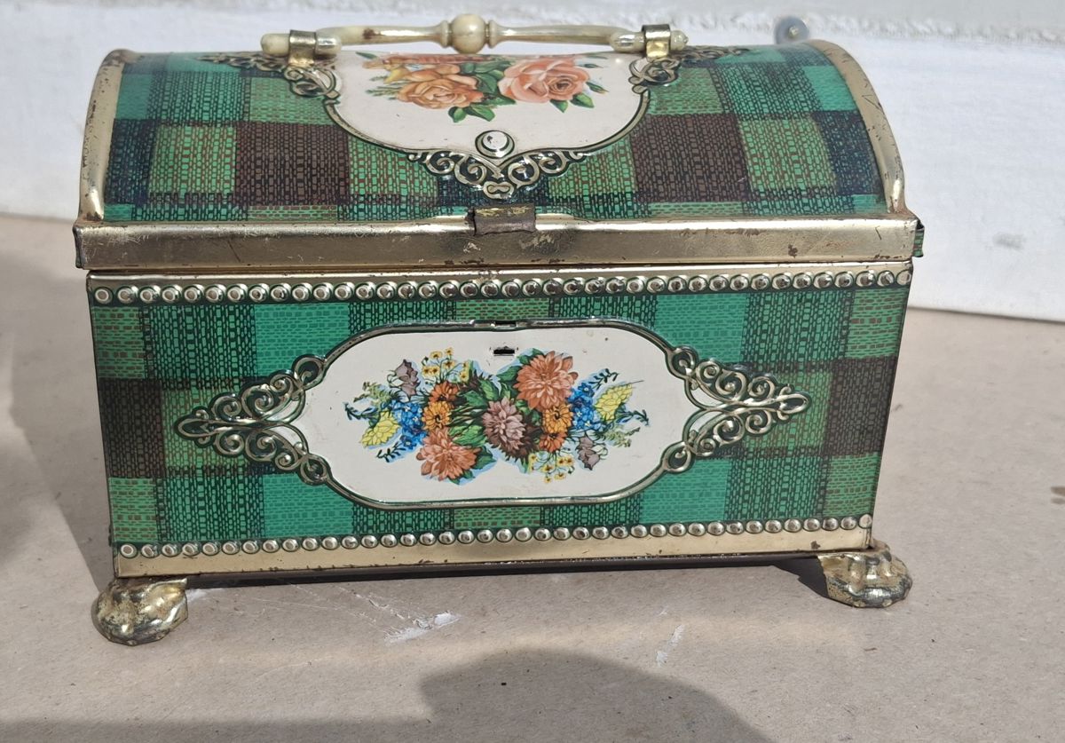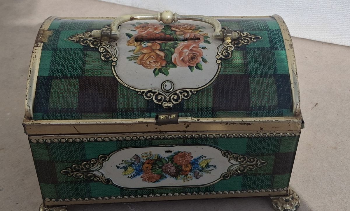 Vintage tin box with floral design and green checkered pattern.