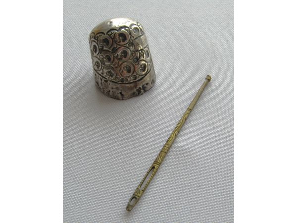 Fully hallmarked Chester 1918 Sterling Silver Thimble (other marks rubbed out and hard to read) - Total weight 1.5g, An engraved gilt metal bodkin, possibly sterling silver but untested dating from around 1860.