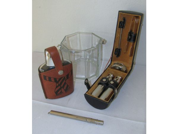 Leather travel case with glass, flasks, mixer, and ice tongs. Pen-shaped vintage wine thermometer. Vintage glass hip flask with leather jacket. An octoganal ice bucket with silver metal handle marked France on the base. All items in this lot in excellent vintage condition.