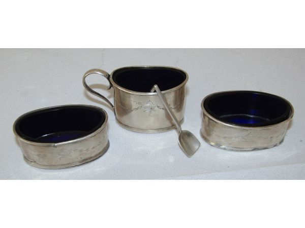 Birmingham 1945 Sterling Silver Hallmarks for Edward Souter Barnsley. Pair of engraved open salts and handled mustard with cobalt blue glass liners. Some wear consistent with age and use to the frames, glass in good condition. Also includes a small condiment spoon with Russian Silver Hallmarks in excellent condition.