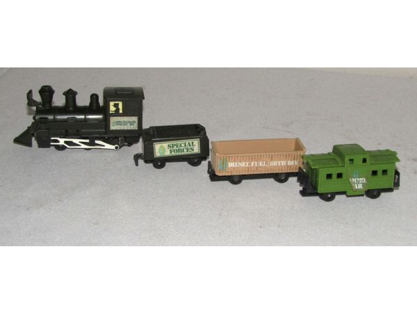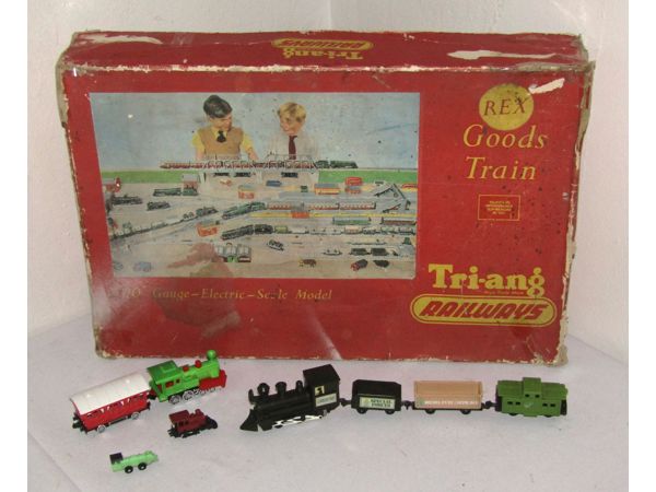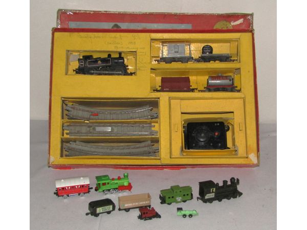 Vintage Triang Goods Train Model Set in original box (untested), Battery (penlight) operated millitary Loco set (untested), Majorette Loco set. Red Loco marked LCB. Cast Iron Loco marked France 1919. Photos form part of the description.