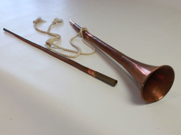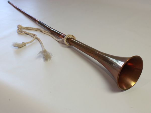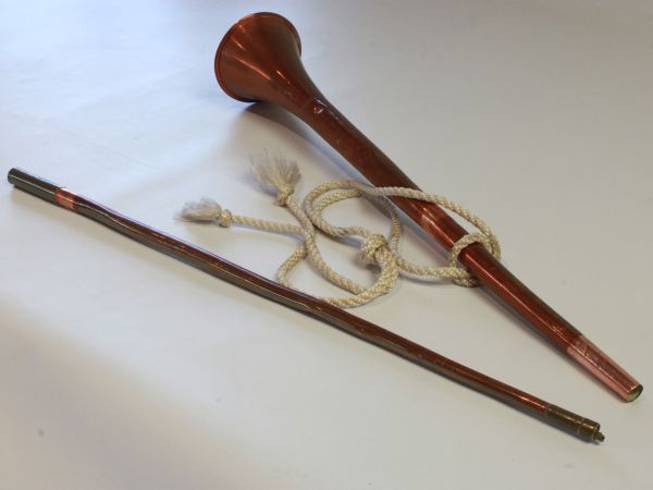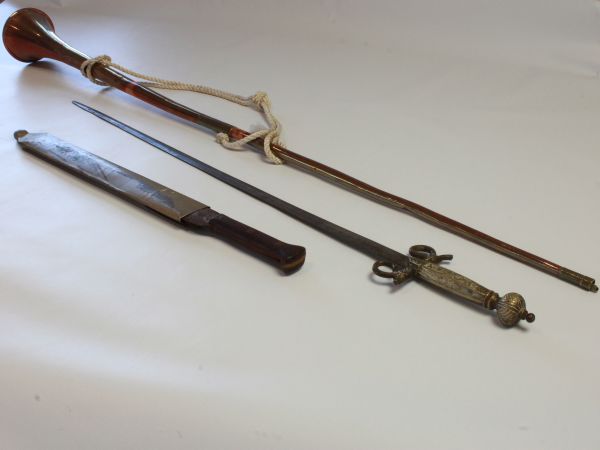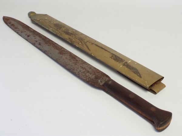 COPPER BUISINE TRUMPET, DRESS SWORD & UNMARKED MACHETE