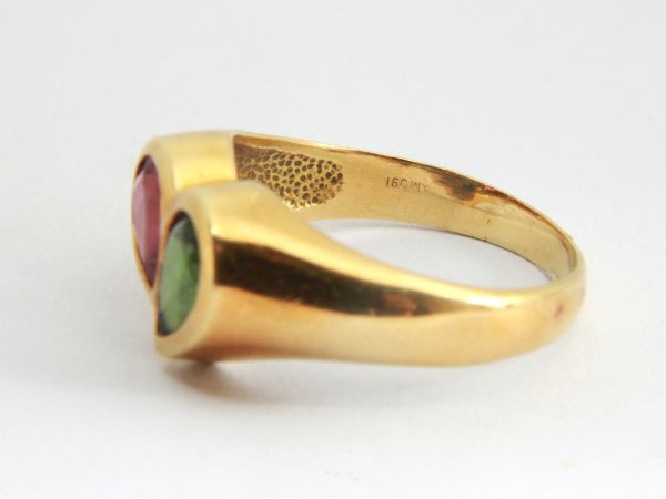 18K GOLD RING SET WITH GREEN + PINK TOURMALINES