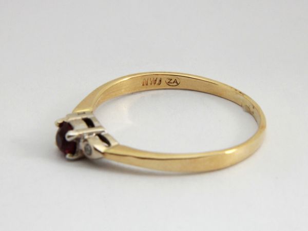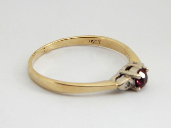 Stamped. Set with a 3mm round ruby flanked by 2 diamonds