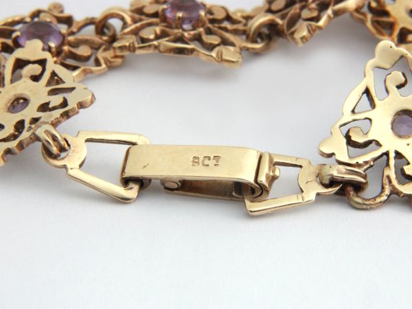 Stamped. Set with 8, 4mm round cut amethysts + 1 in extra link