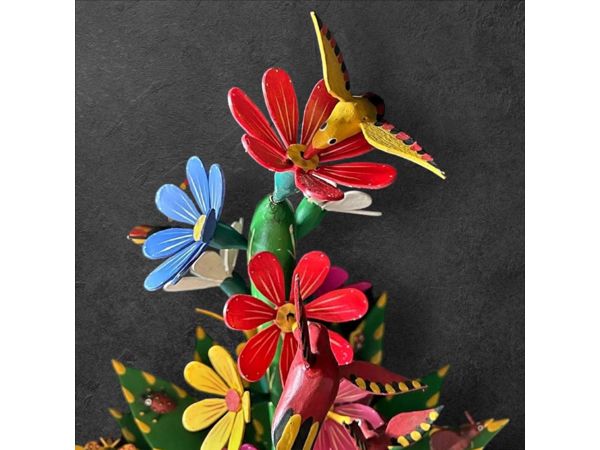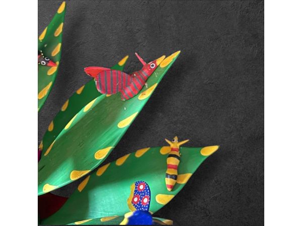 hand carved and painted wood sculpture of a blooming cactus with feeding birds and various insects.