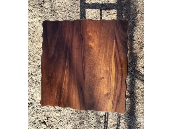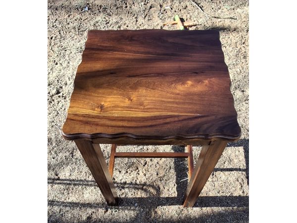 Solid wood side table with a scalloped edge design.
