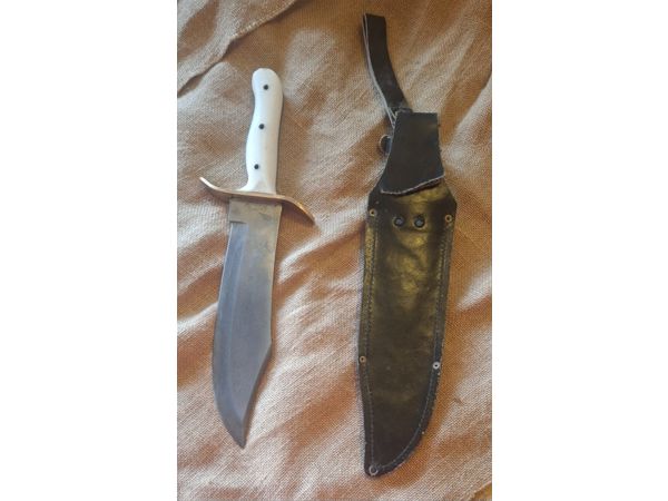 Vintage Bowie Knife featuring a stainless steel blade and a white handle with decorative pins.