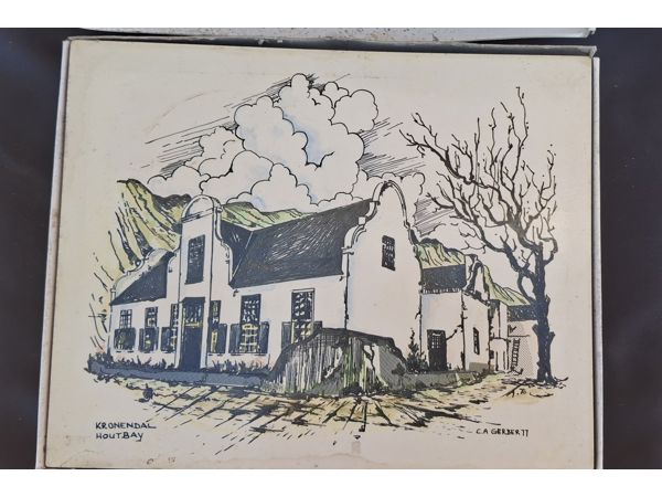 Set of hand made table mats by Drostdy Ware featuring illustrated scenes of historical South African locations.