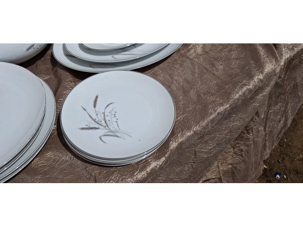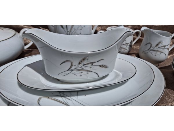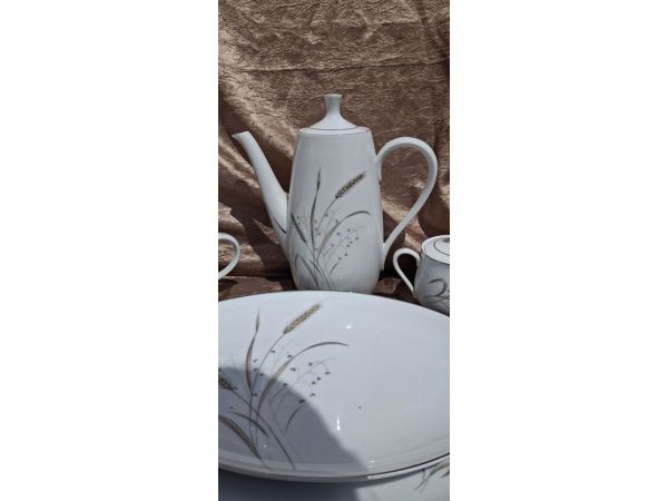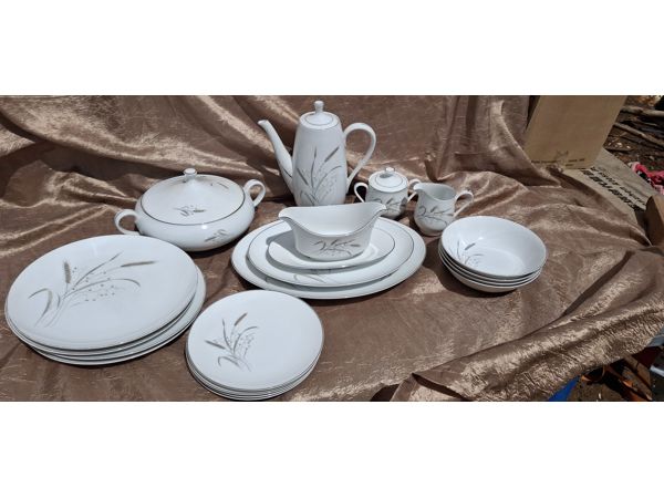 Includes teapot, sugar bowl, creamer, serving plates, soup bowls, and gravy boat