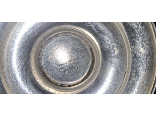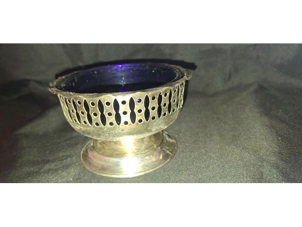 Vintage silver plated bowl with pierced design and cobalt blue glass insert.