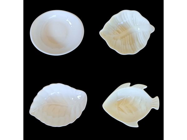 1) 16 x Oval Bowl 13cm x 11cm x 3cm 2) 26 x Leaf Sauce Bowls 10cm x 7,5cm x 3cm 3)22 x Leaf 8cm x 7cm x 3cm 4)16 x Fish Sauce Bowls 9cm x 8cm x 3cm