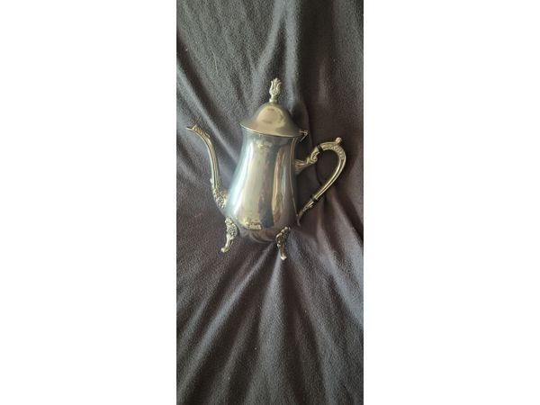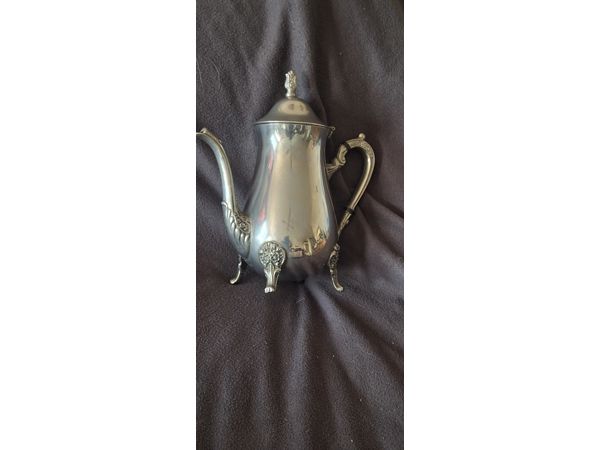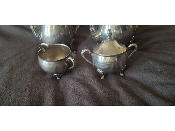 Vintage silver plated tea and coffee set including teapot, coffee pot, sugar bowl, and creamer.