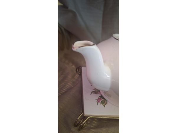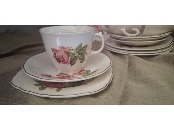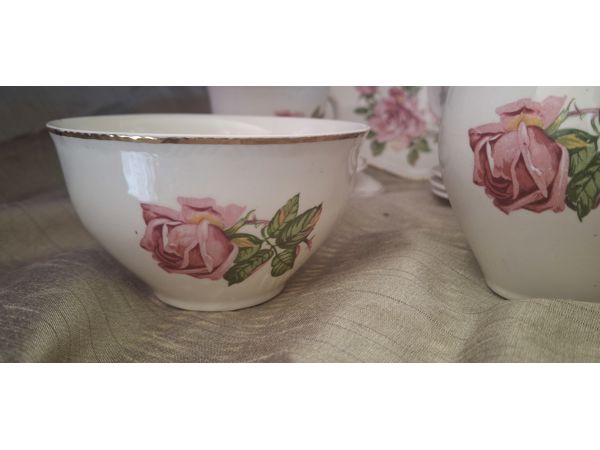 Vintage Rose Pattern Tea Set including a teapot, creamer, cups, saucers, and serving plate.
