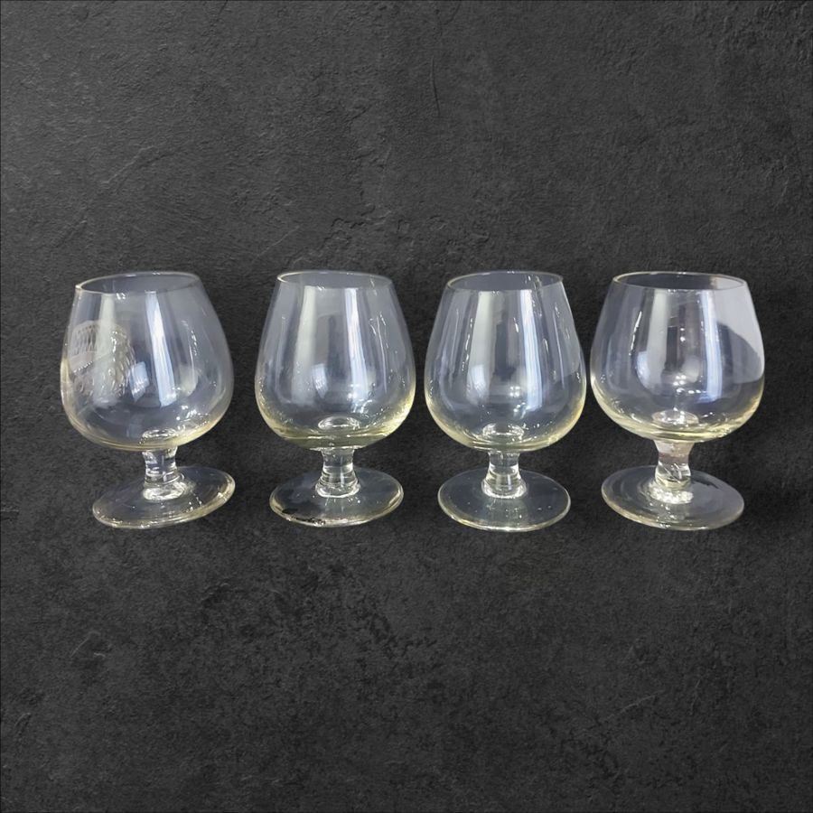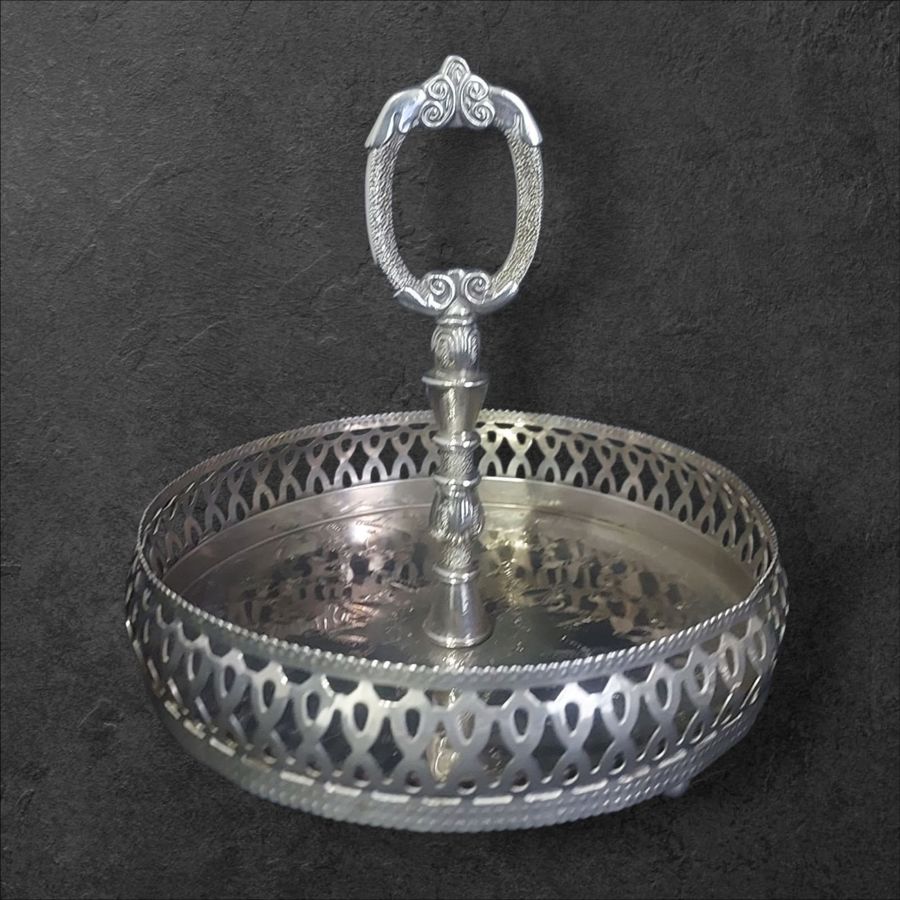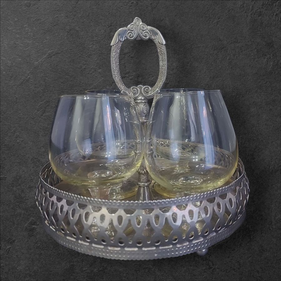 Silver-plated holder with decorative handle, accompanied by four matching clear glasses.