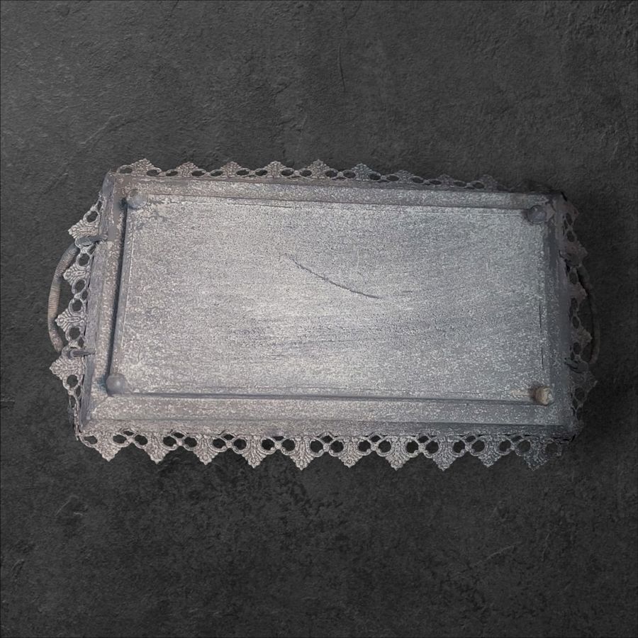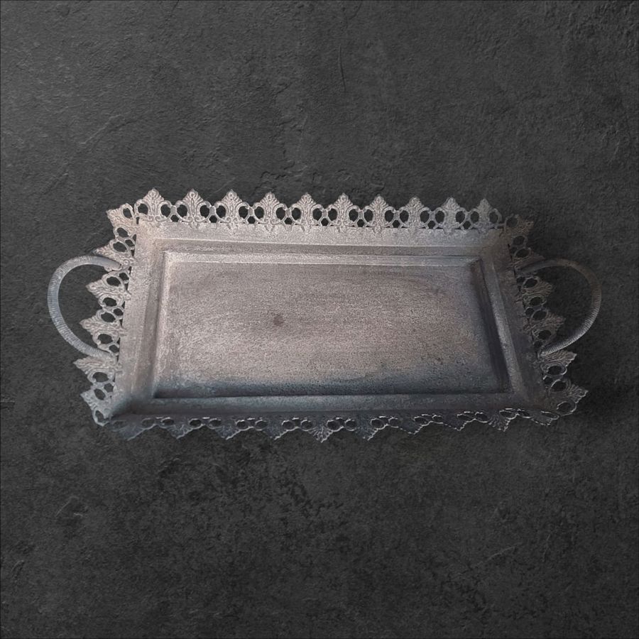 Vintage metal serving tray featuring an intricate decorative edge and sturdy handles.