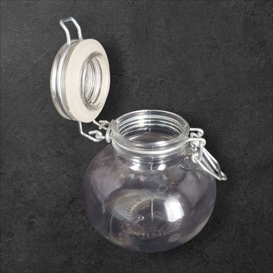 Set of 3 rounded glass storage jars with metal clasp lids.