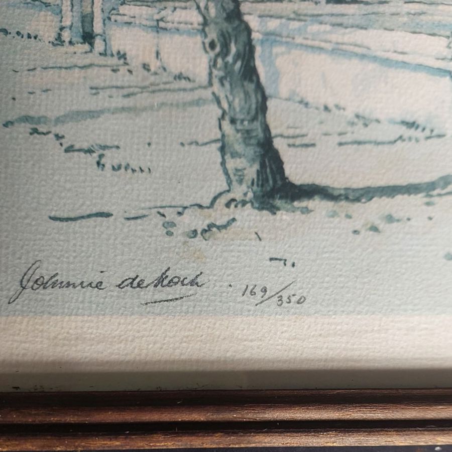 Limited edition print by artist Johnnie de Kock, signed and numbered 169/350. Framed artwork featuring a serene landscape scene with a church and trees. Excellent condition.