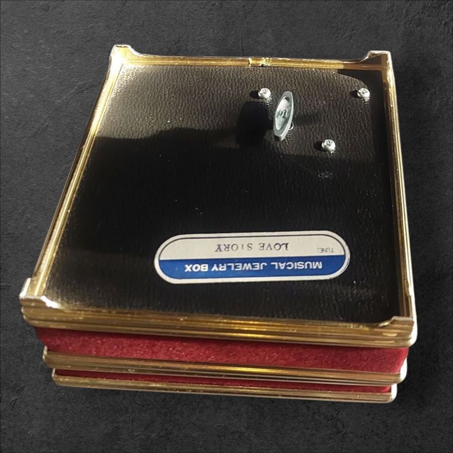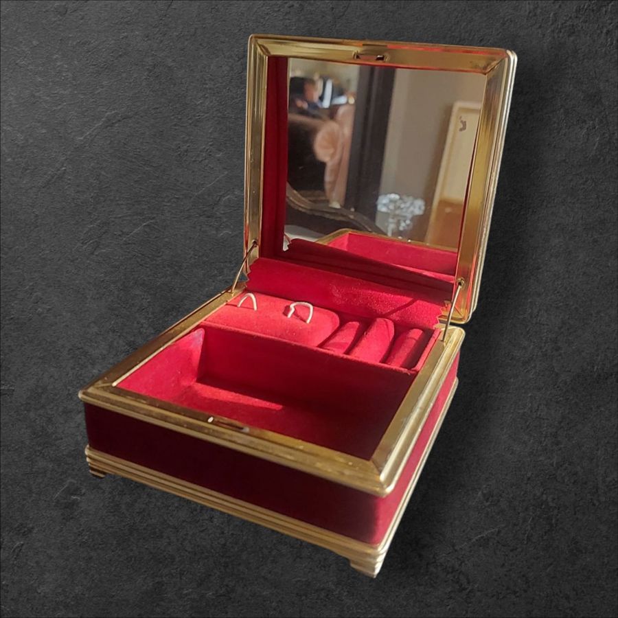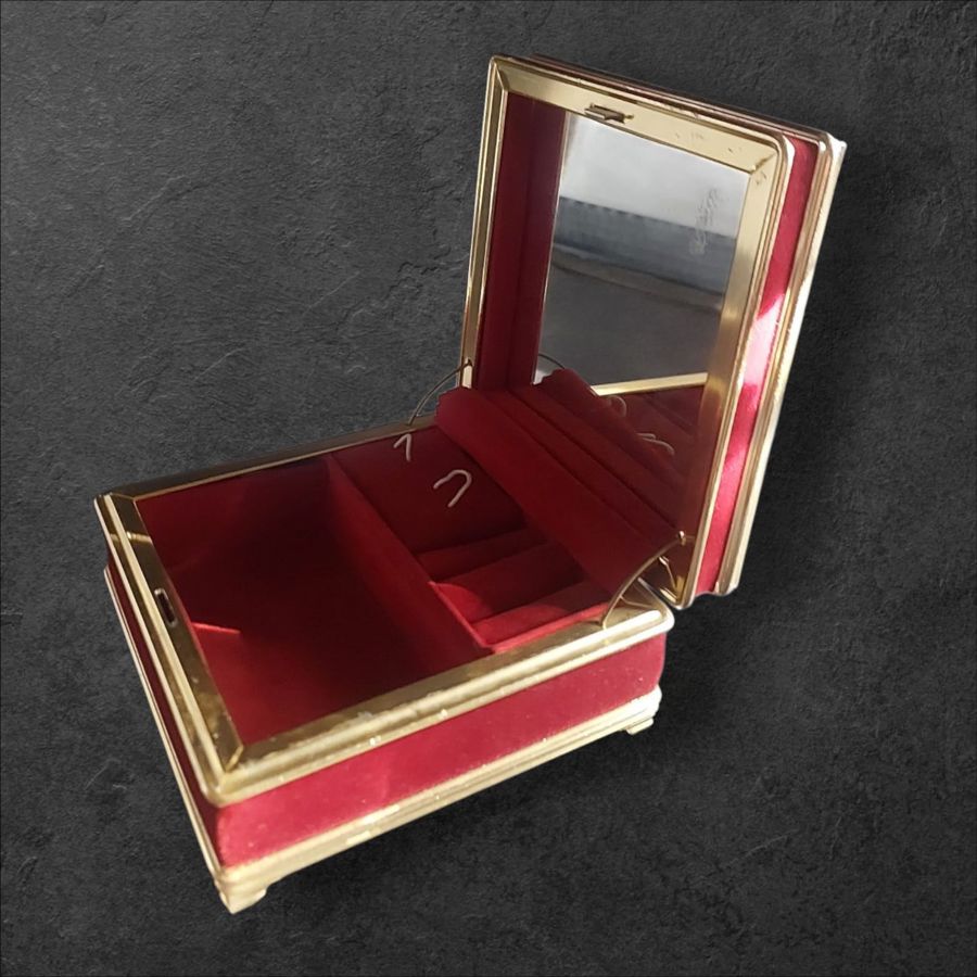 Vintage musical jewelry box with a vibrant red velvet exterior and gold-tone trims.