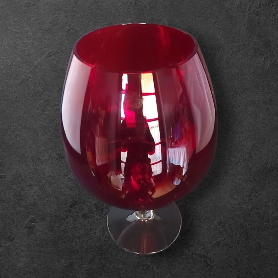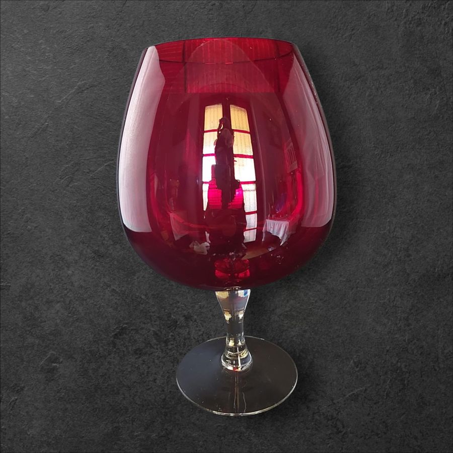 Large red wine glass display piece.