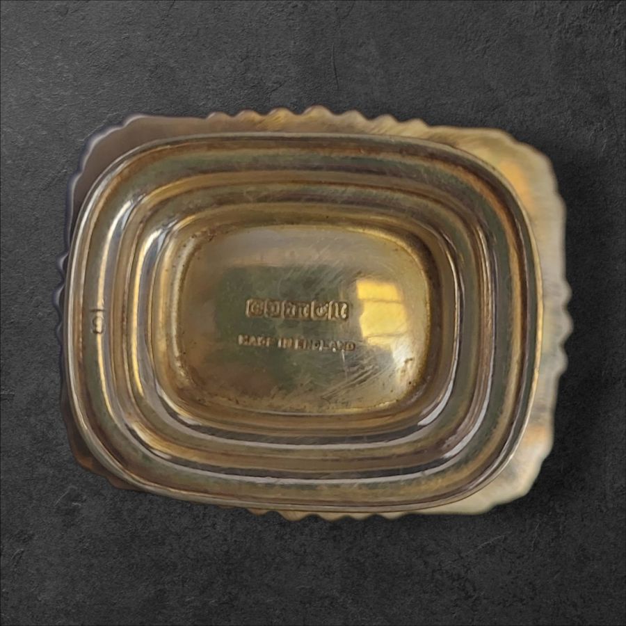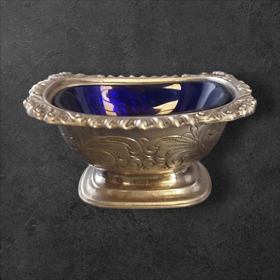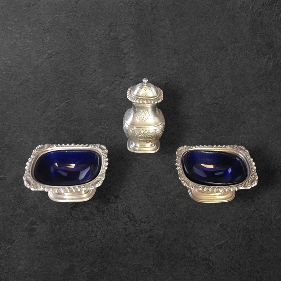 Silver plate condiment set featuring two bowls and a shaker, each with cobalt blue liners.