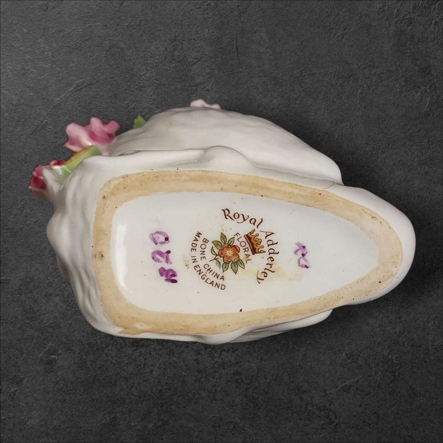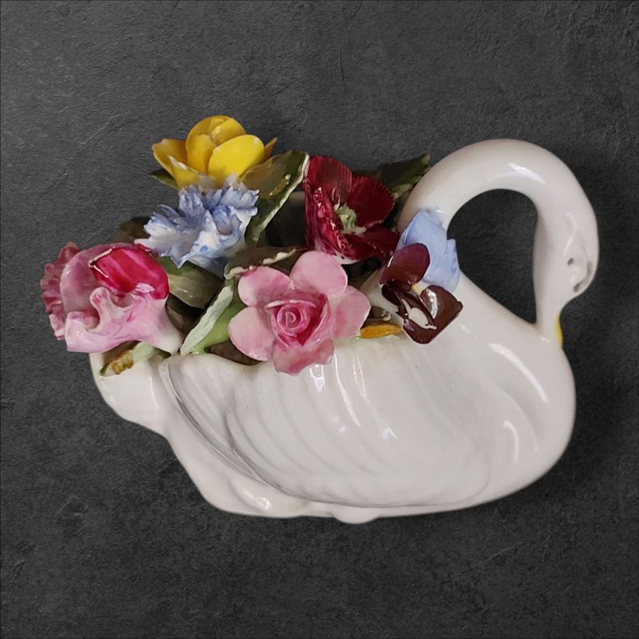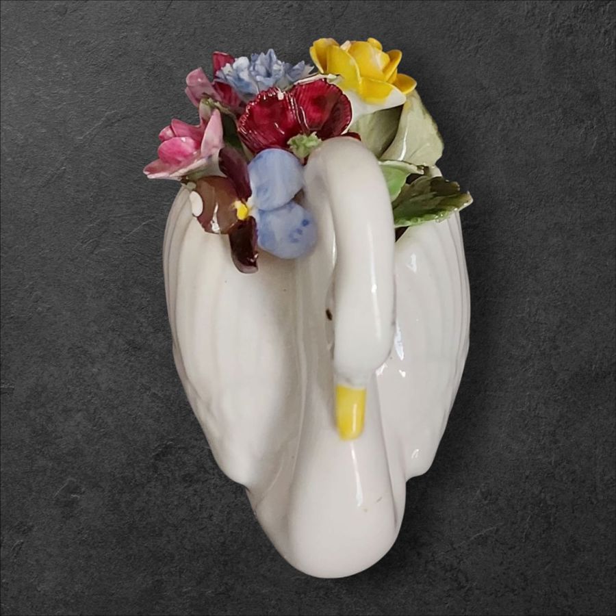 Royal Adderley porcelain swan adorned with a vibrant floral arrangement.