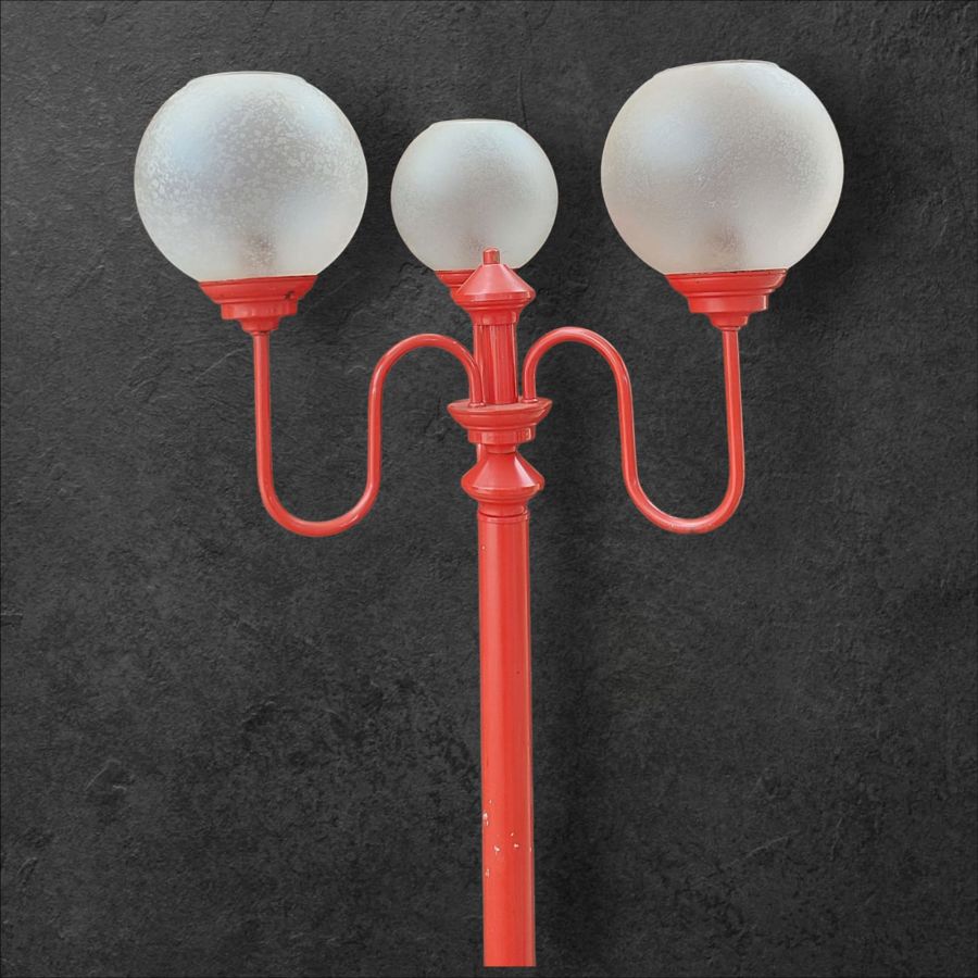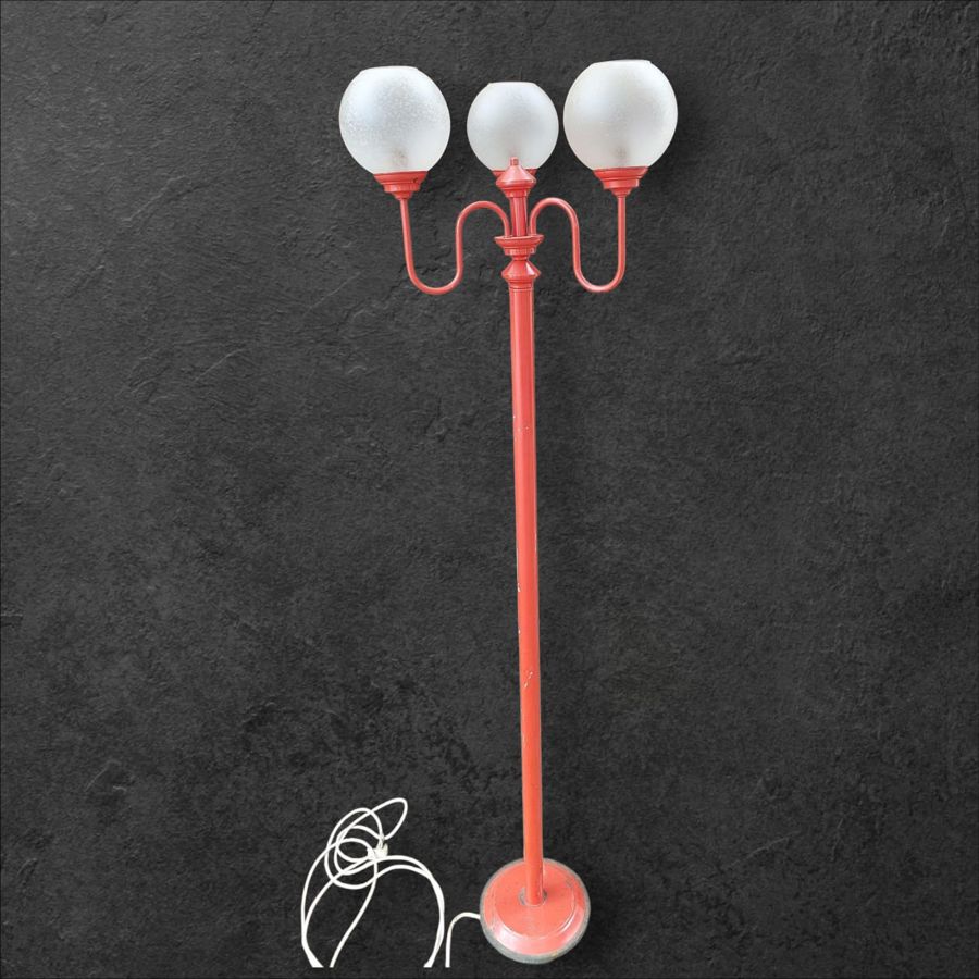 Vintage red floor lamp with three frosted glass globes.