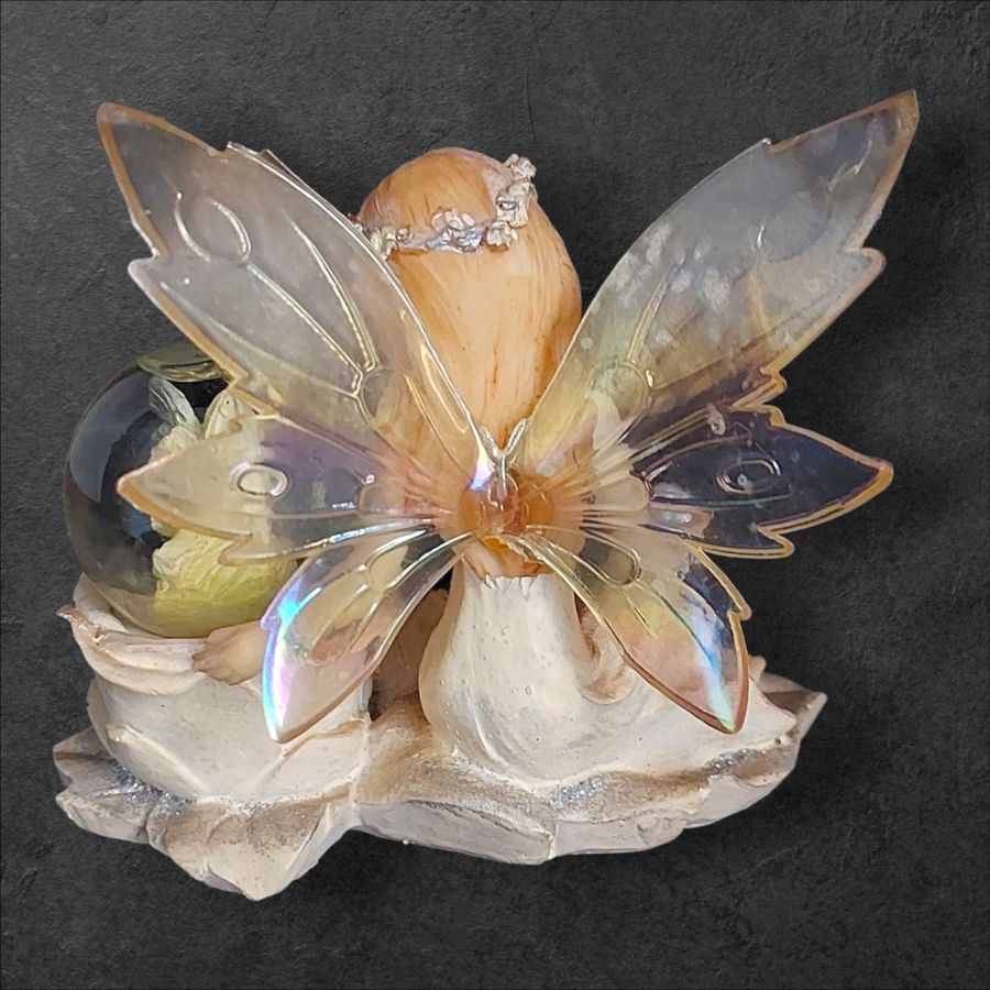 Delicate fairy figurine featuring a seated fairy with iridescent wings and a crystal ball.