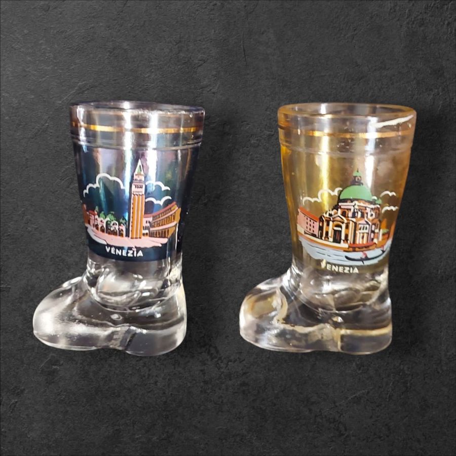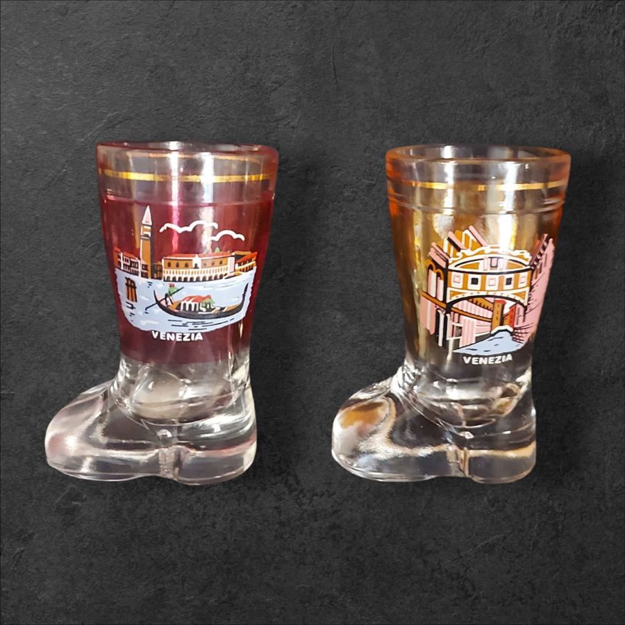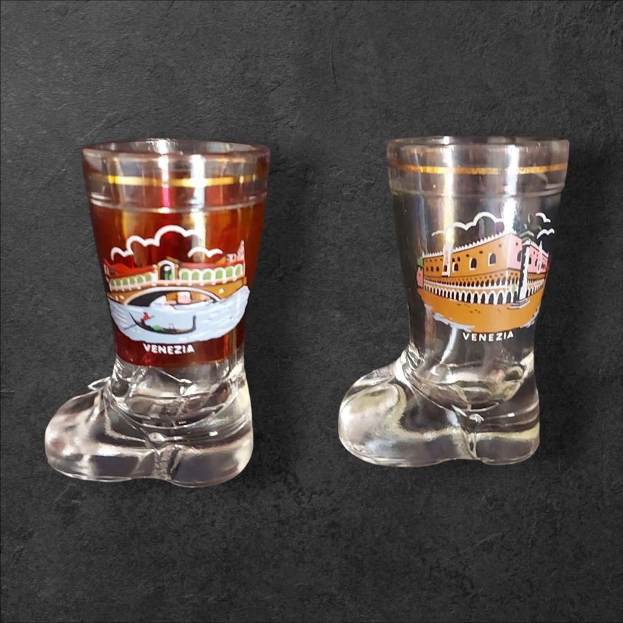 Set of 6 Venetian boot-shaped shot glasses.