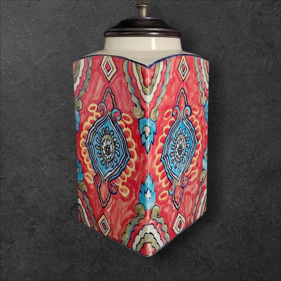 Ceramic jar featuring vibrant geometric patterns in red, blue, and white.