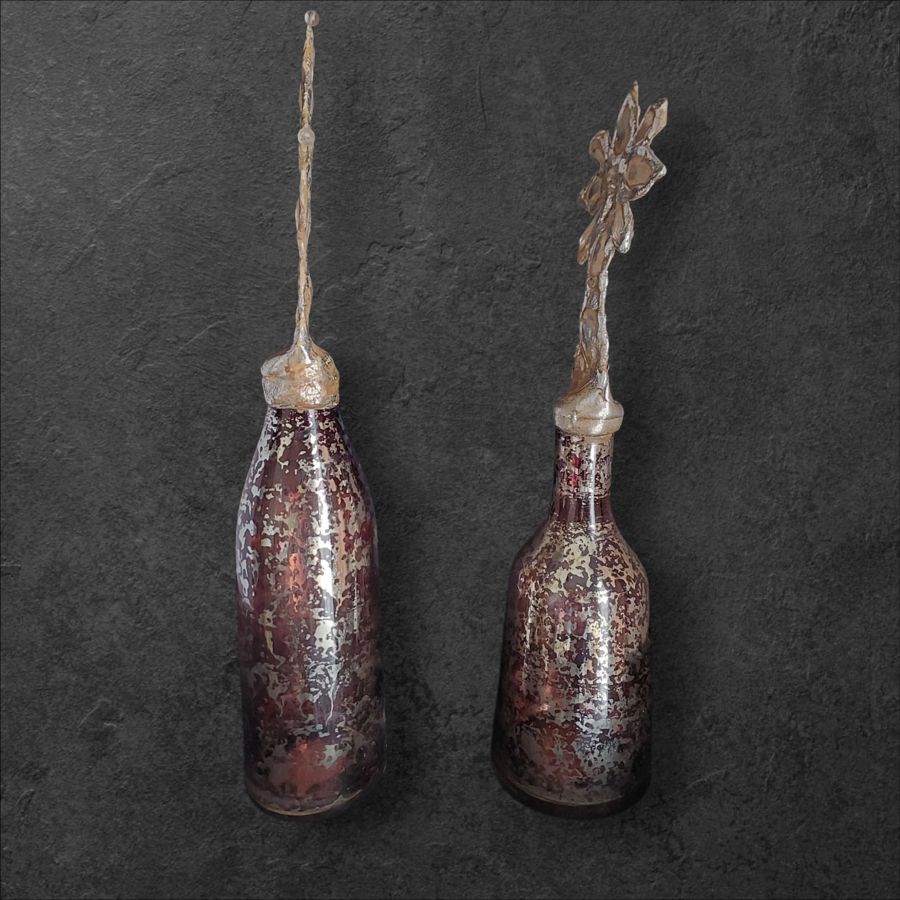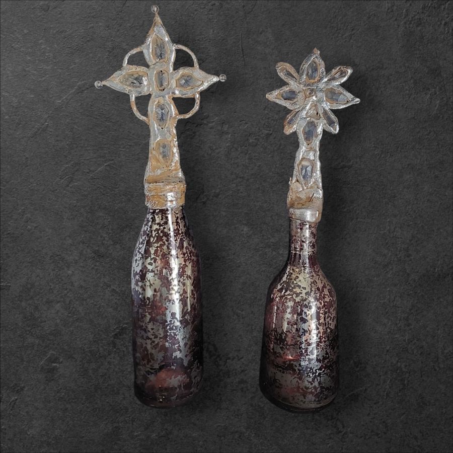 Pair of decorative antique-style glass bottles with ornate stoppers.