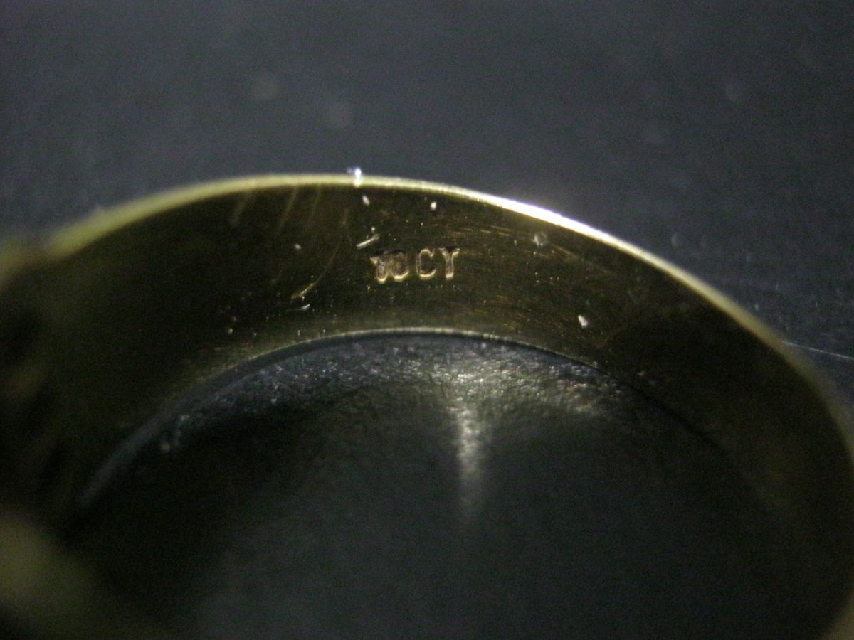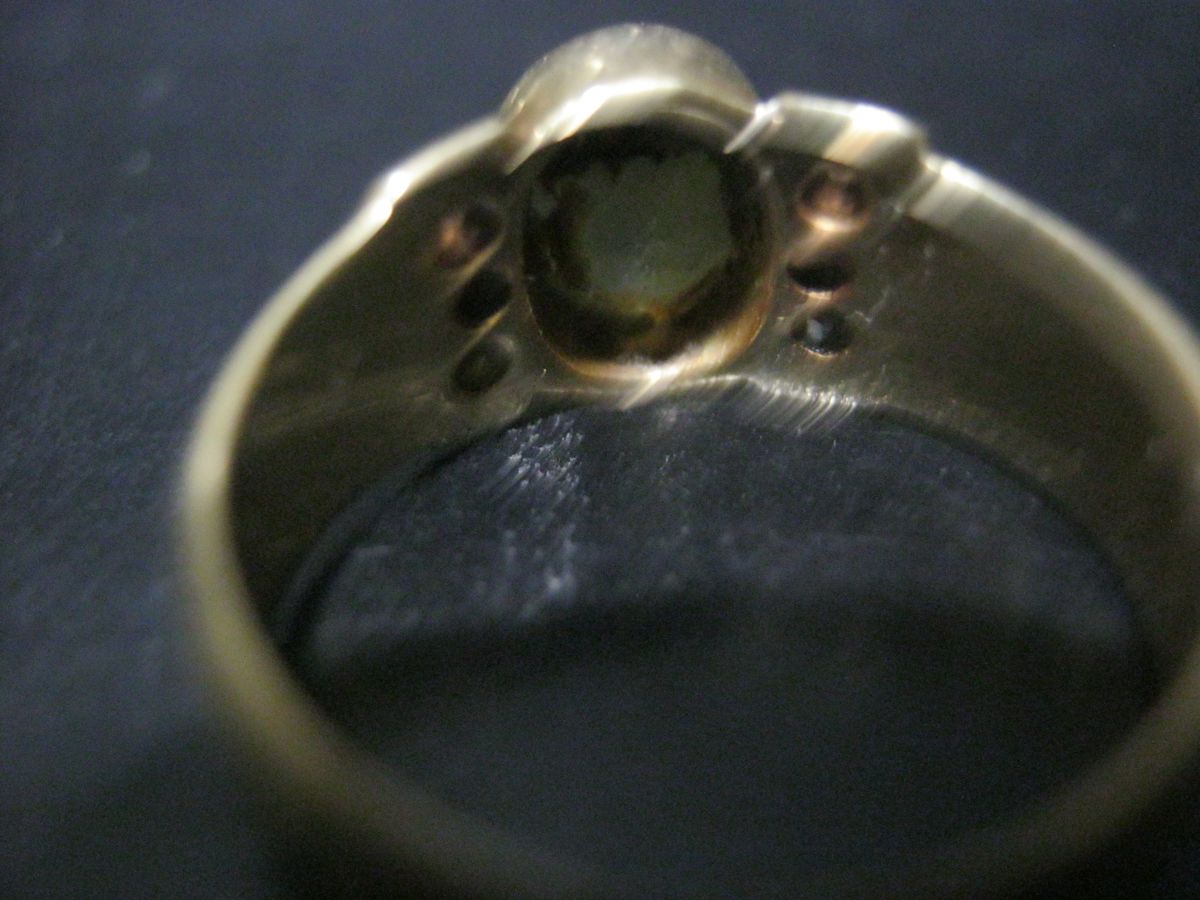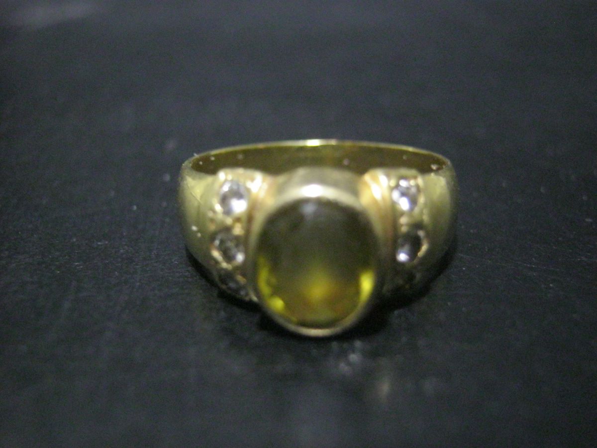 18CT GOLD RING WITH PERIDOT AND DIAMONDS, Peridot 8mm Long and Scratched, 6 x Diamonds approx 0.03ct each , 5.4g Total Weight