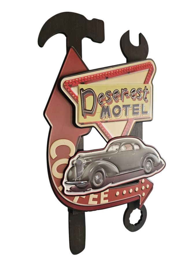 256 - Deser-est Motel Tin and Wood sign 60hx35w