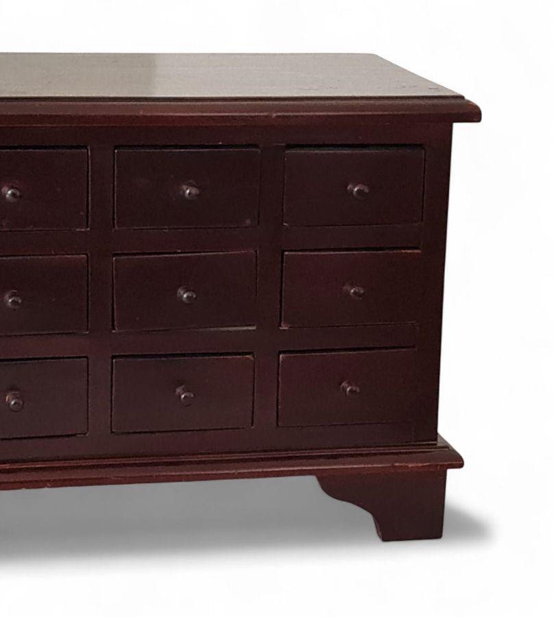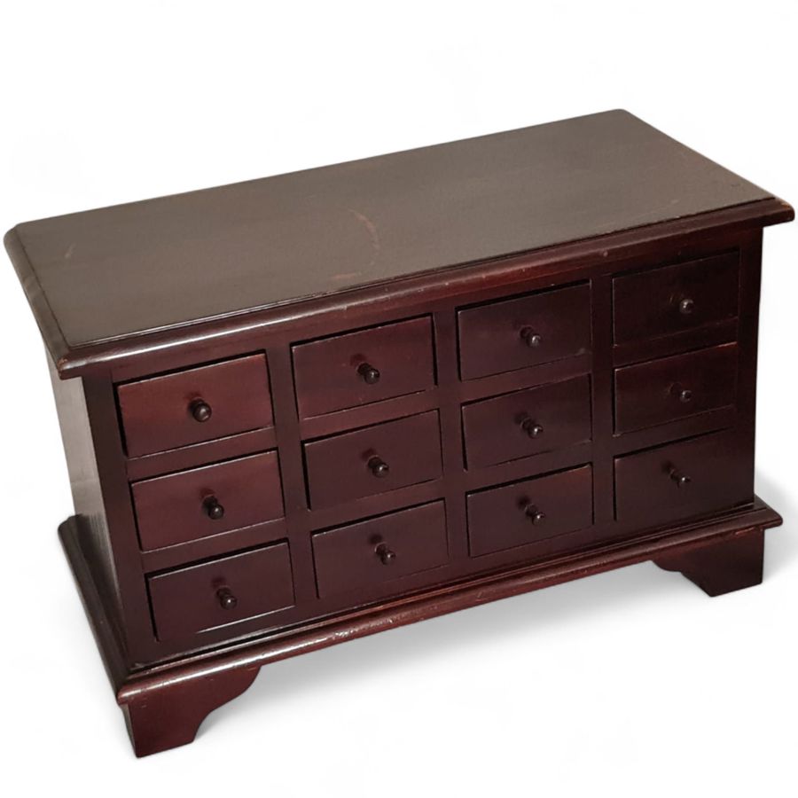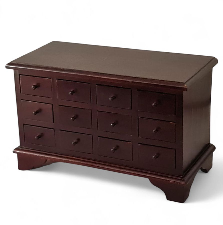 Elegant Small Mahogany Chest of Drawers with 12 drawers, perfect for jewellery, collectibles, or small household items. A bit larger than a typical trinket chest, making it a versatile medium-sized storage piece.