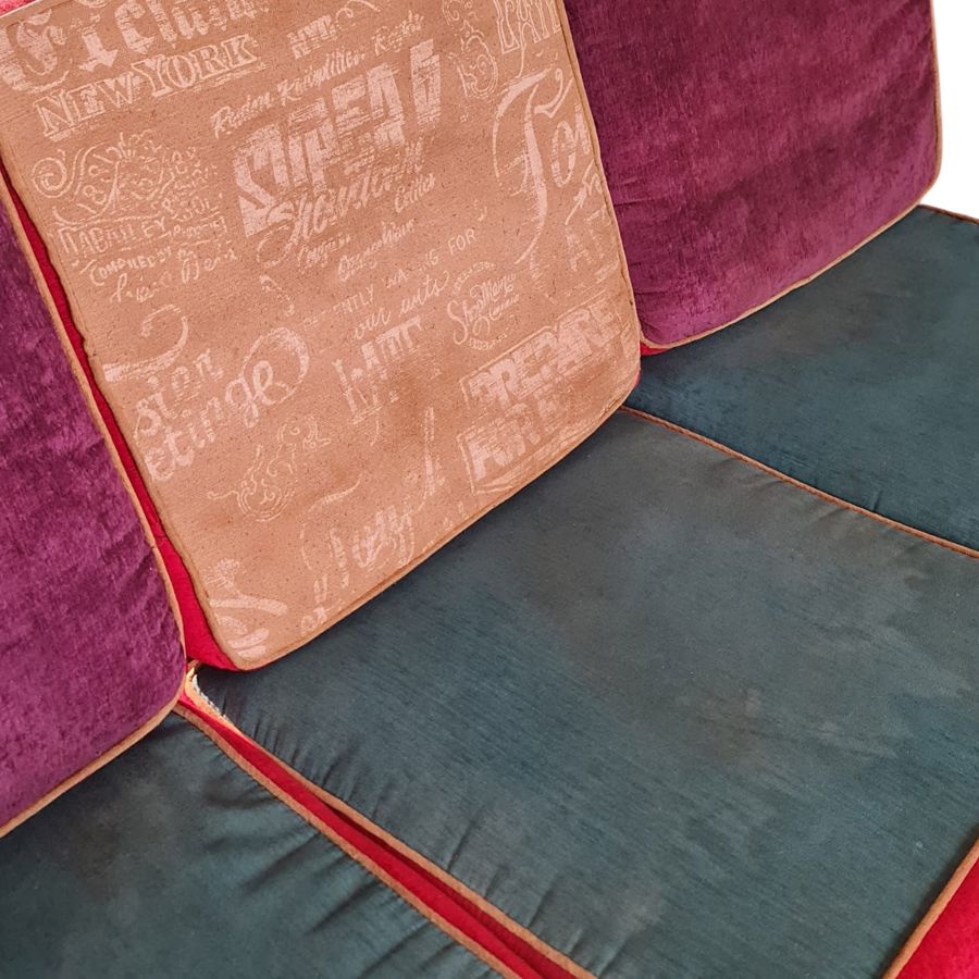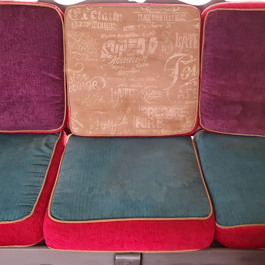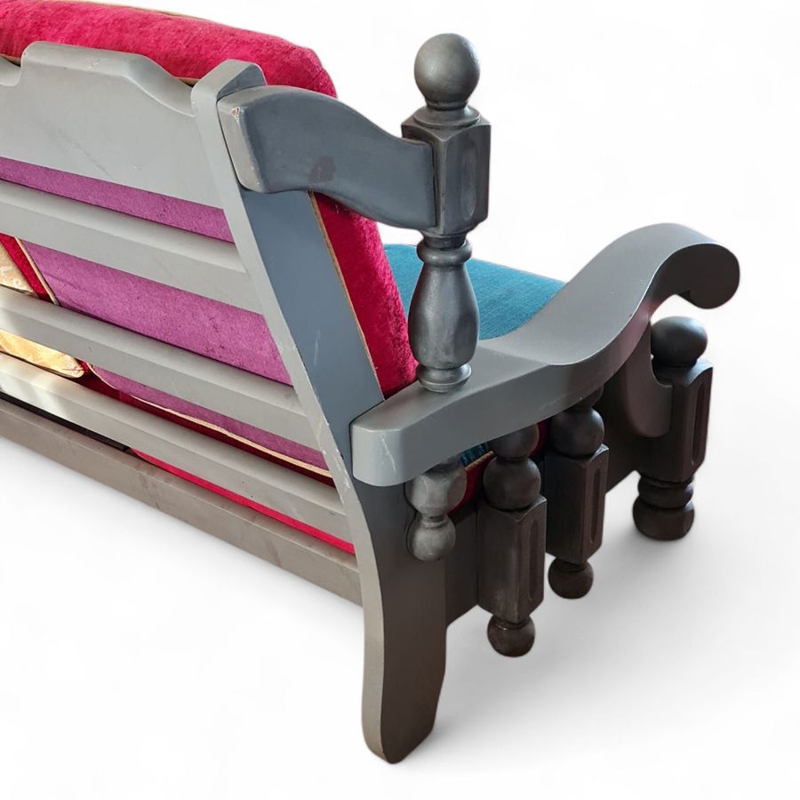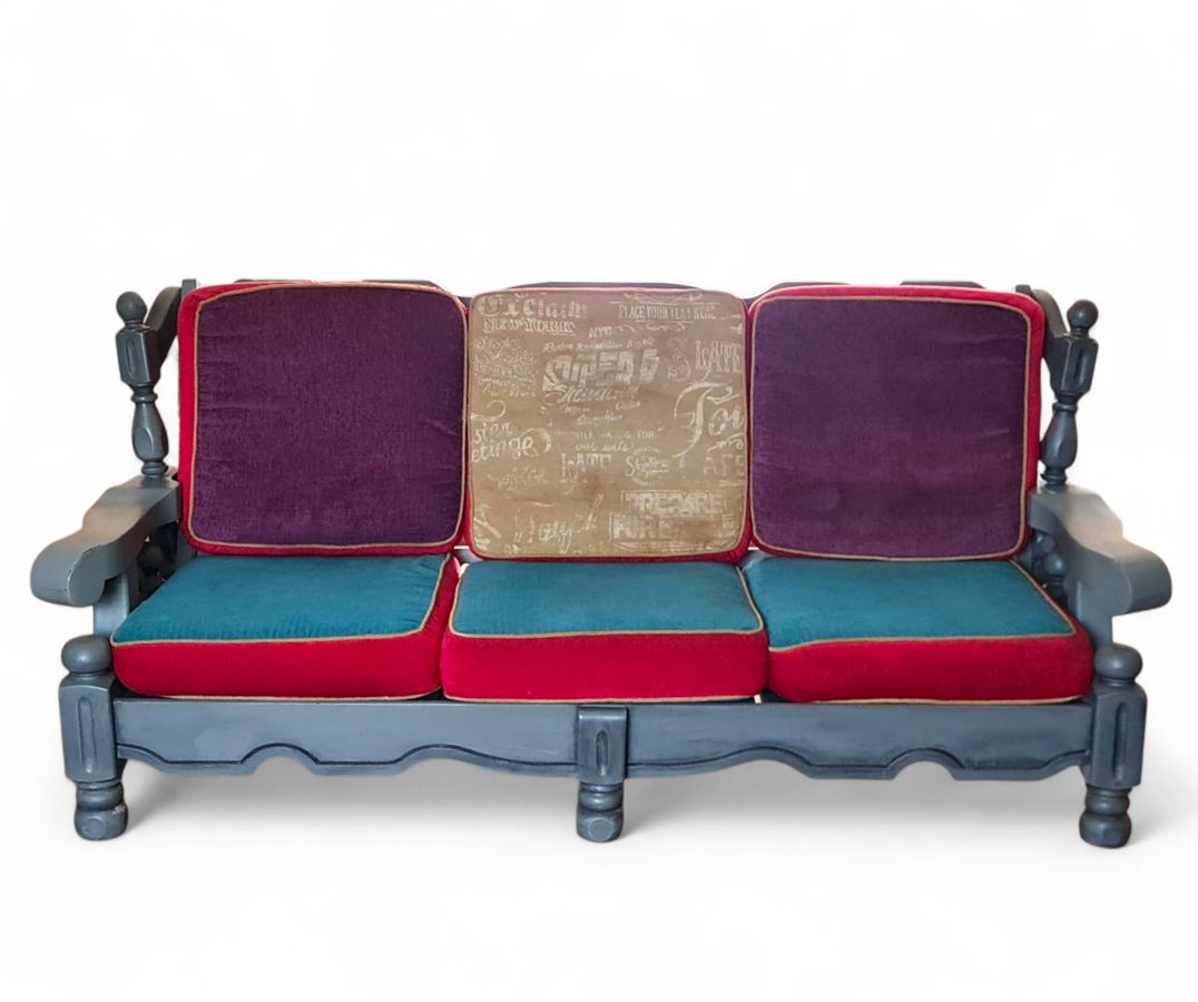 Vintage wooden sofa featuring a sturdy frame with decorative spindles and armrests.