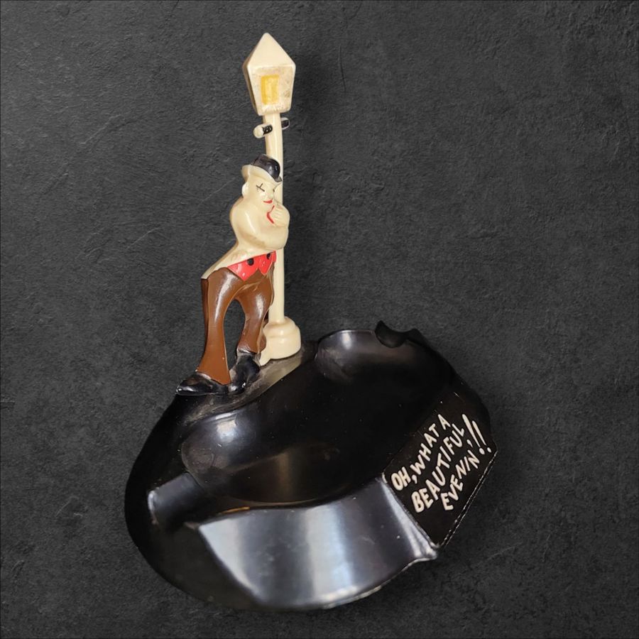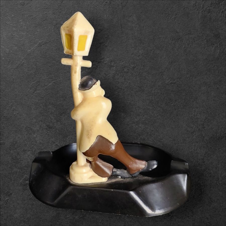 Vintage 1950s novelty ashtray depicting a humorous drunk character leaning against a streetlamp.