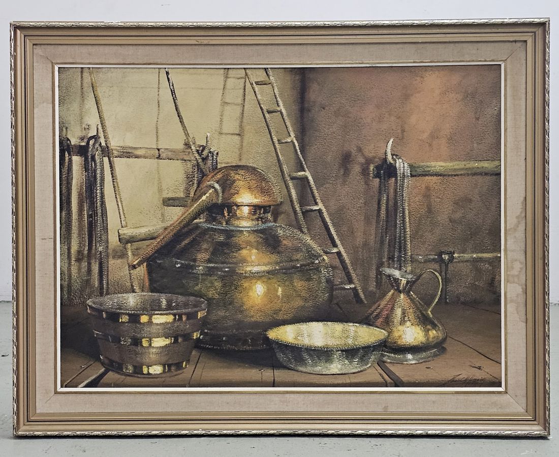 Large Framed Signed Denzil Herring framed Still Life oil painting on board-Brass Kettle
