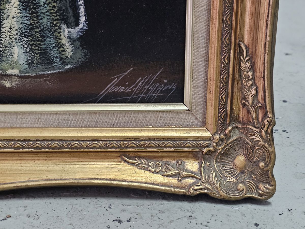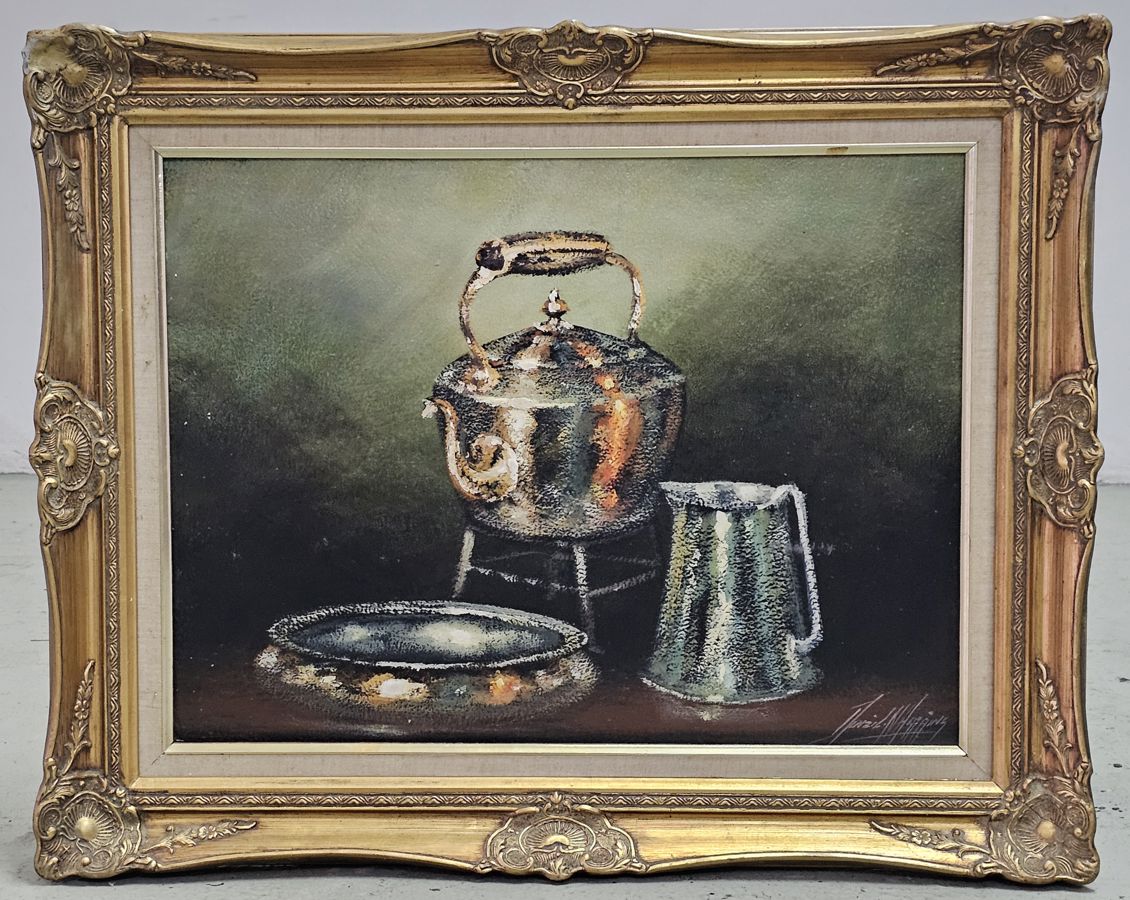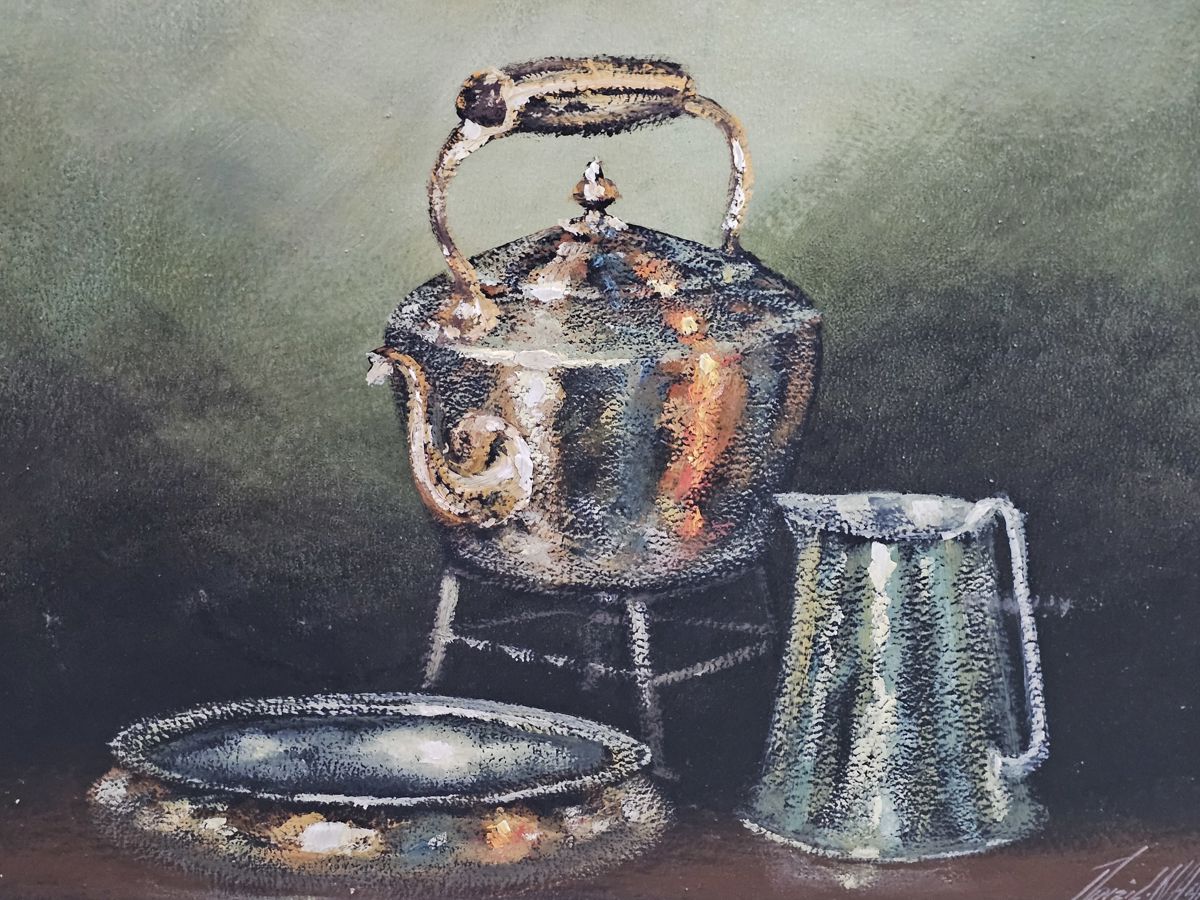 Signed Denzil Herring framed Still Life oil painting on board-Brass kettle on stand