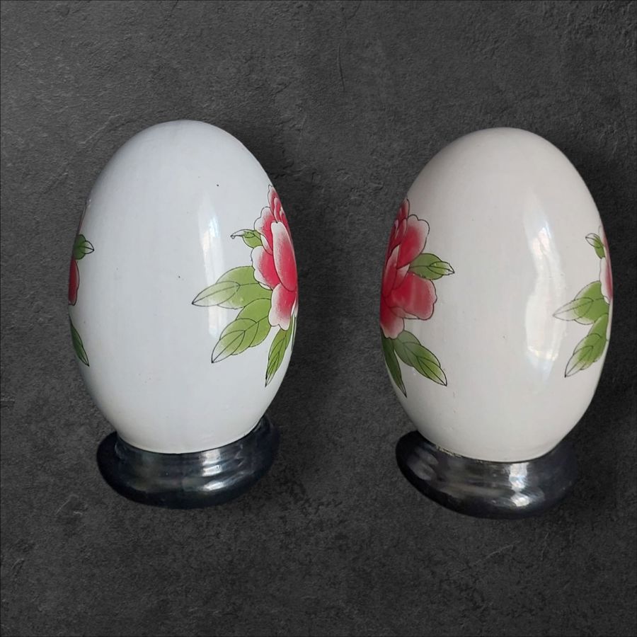Pair of vintage ceramic eggs with hand-painted floral designs.
