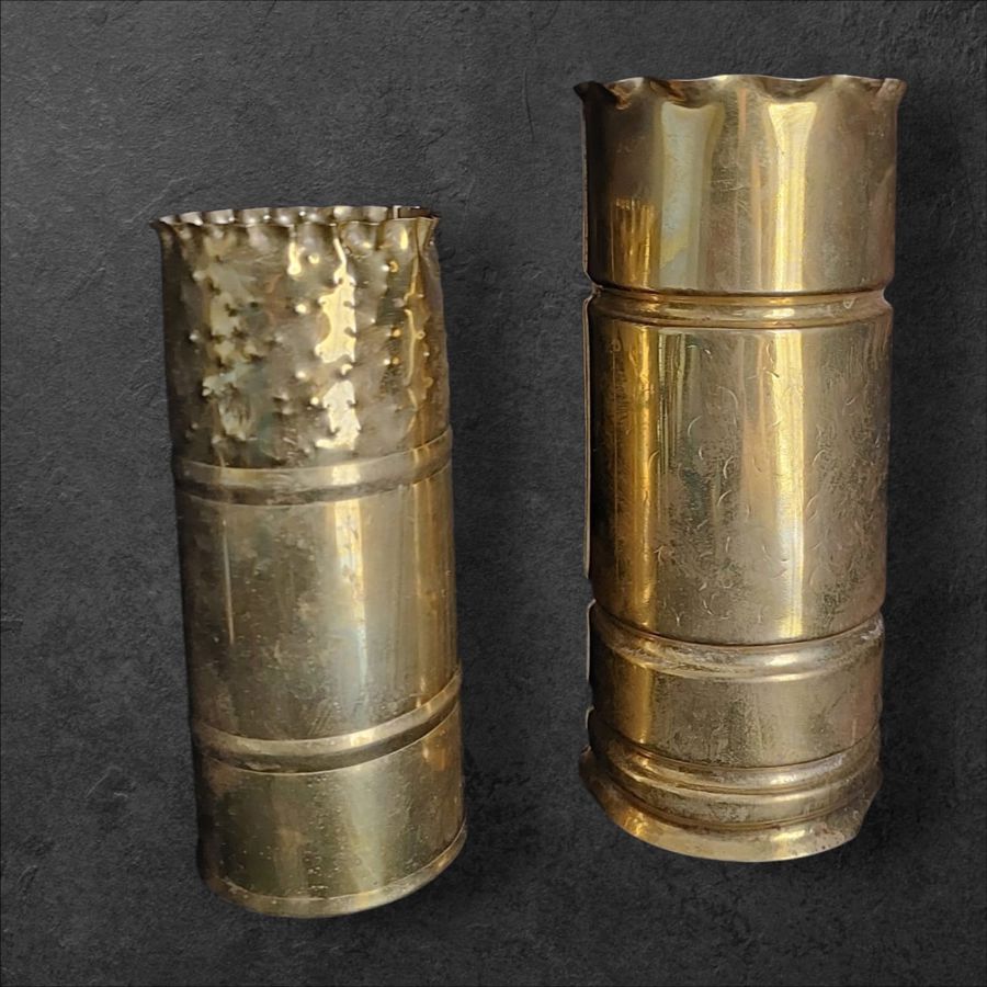 Pair of brass vases crafted from artillery shells.