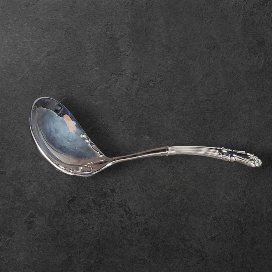 Antique silver-plated gravy ladle featuring a decorative handle and deep, rounded bowl. Ideal for serving gravies or sauces. Excellent vintage condition with minimal wear consistent with age. Perfect for collectors or for enhancing table settings.