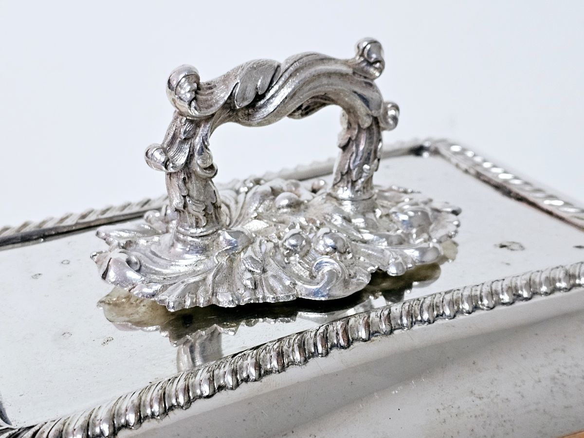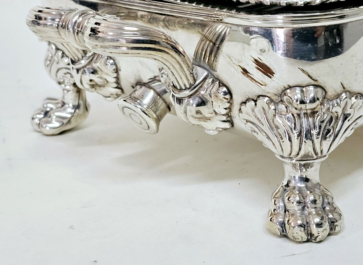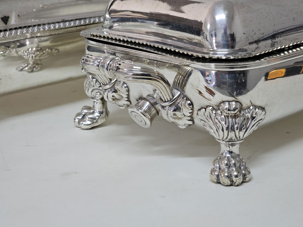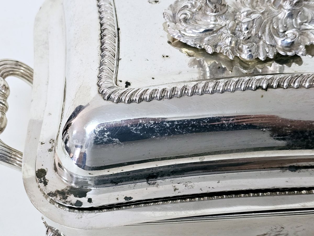 entree dish, rectangular form, featuring a footed warming base with four lion's paw feet, two ornate reeded handles with shell motifs, and gadrooned borders. Lid has a decorative handle,  the base are engraved with a central armorial crest depicting a standing  lion.