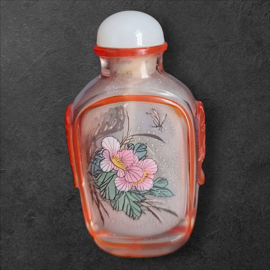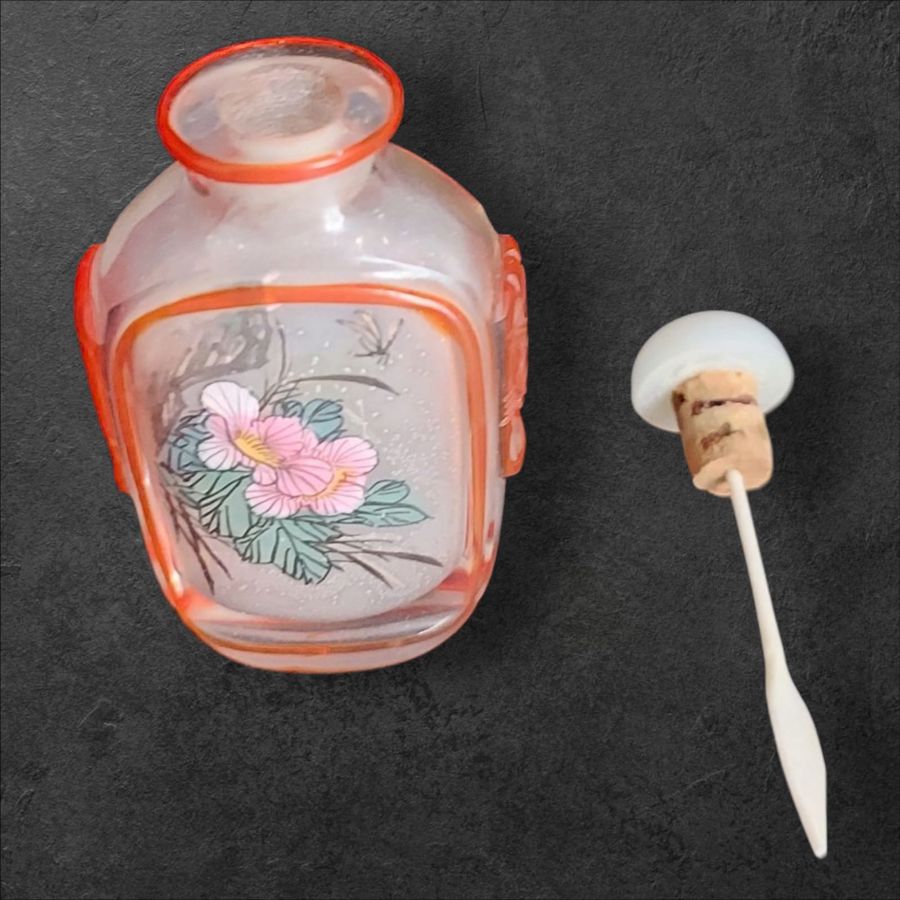 Hand-painted Chinese snuff bottle featuring detailed landscape and floral designs.