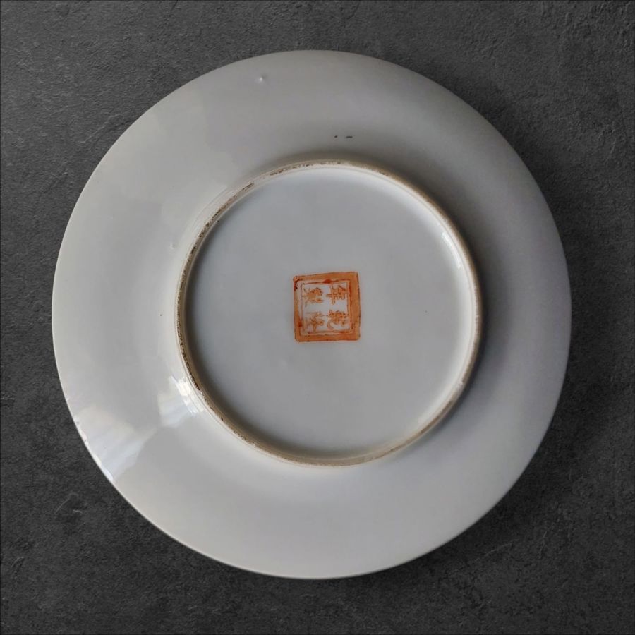 Vintage Chinese porcelain plate featuring a traditional motif of two figures within an ornate border.