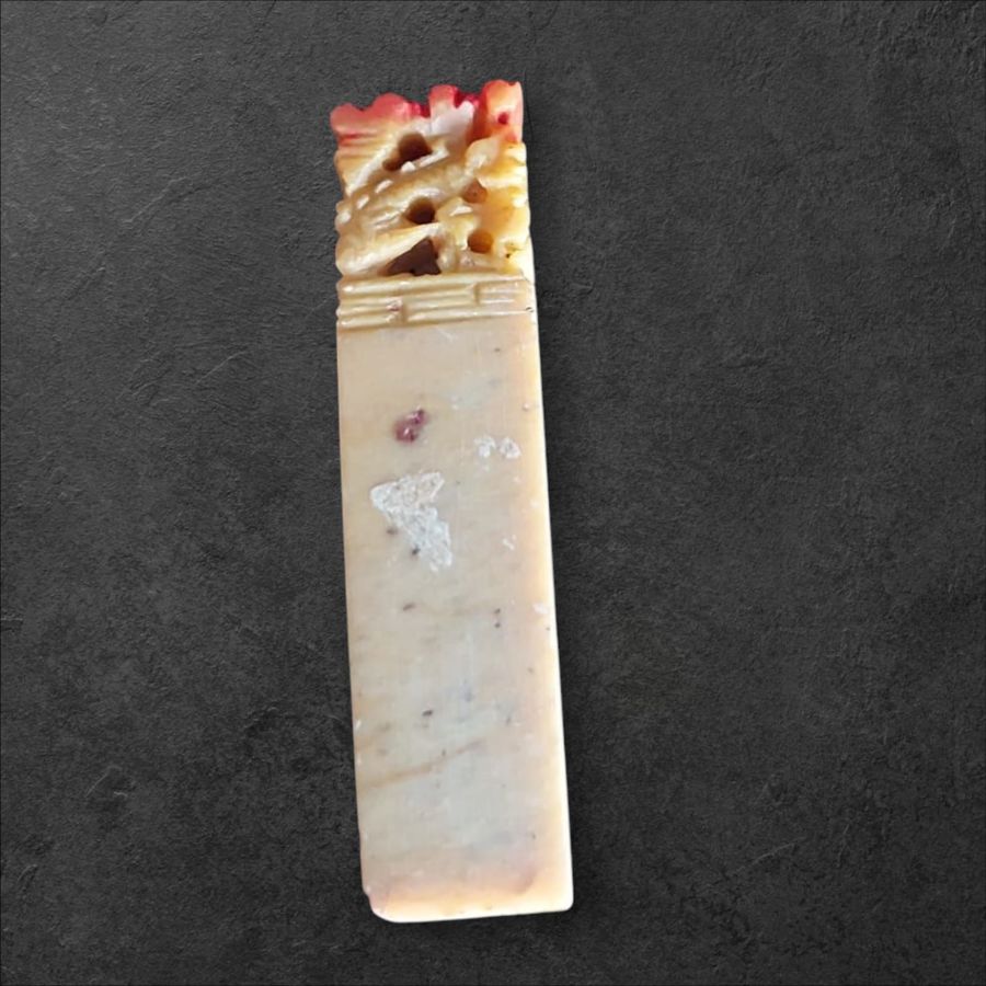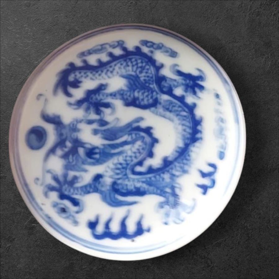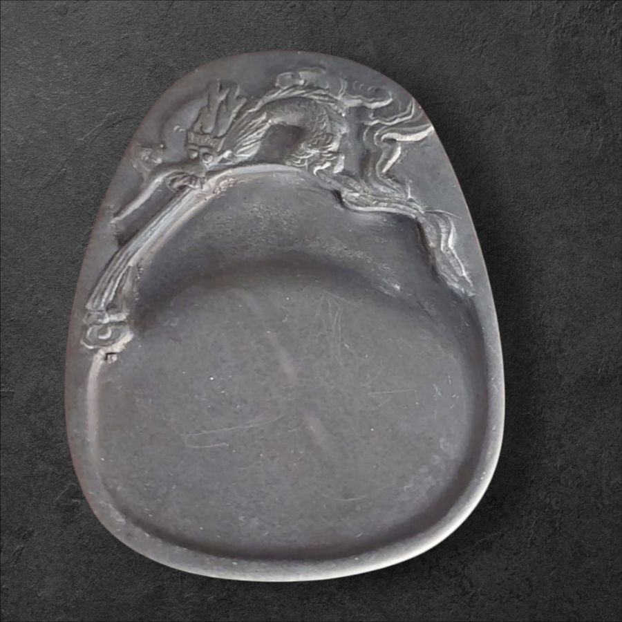 Components: Ink stone with dragon motif, ink stick, brush rest, porcelain water pot, and seal