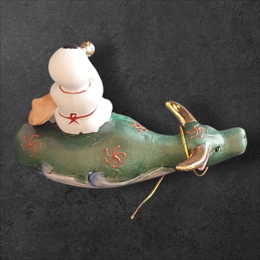 Details: Child holding a small object, ox decorated with floral motifs and gold accents.