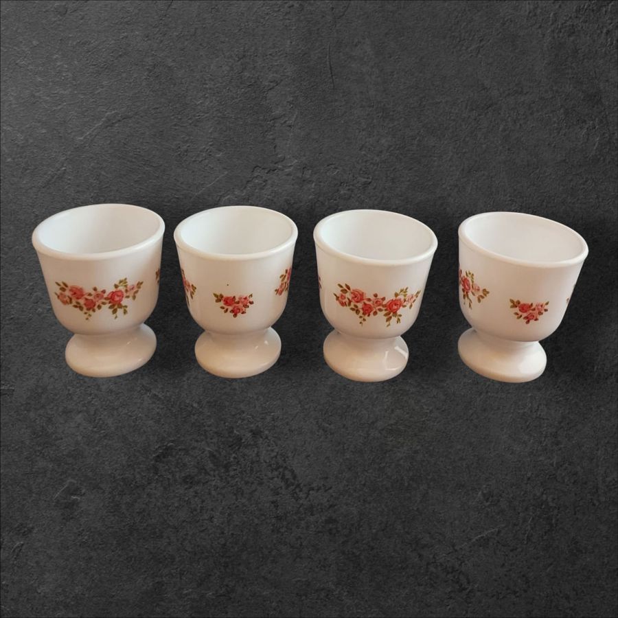 Set of 4 Vintage Milk Glass Egg Cups with floral pattern.