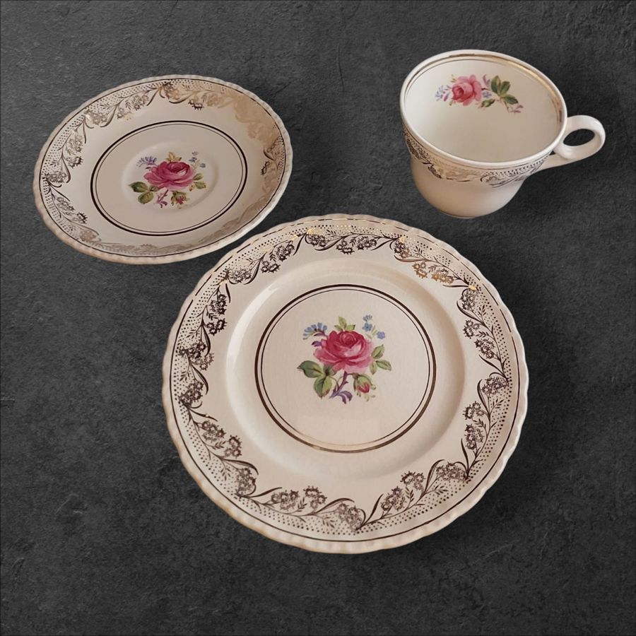 Components: Includes a teacup, saucer, and dessert plate